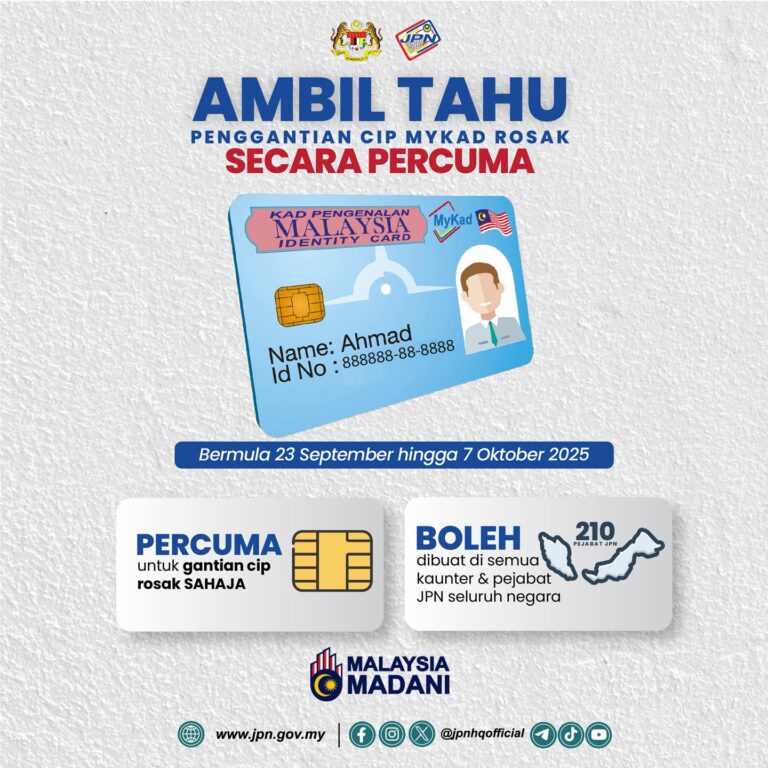 AMBIL TAHU !! Selaras dengan pengumuman YB Menteri Dalam Negeri, mulai 23 September hingga 7 Oktober 2025, JPN menawarkan gantian cip MyKad rosak secara PERCUMA di semua pejabat dan kaunter JPN seluruh negara.⚠️ Penting untuk diketahui: Tawaran ini hanya melibatkan […]